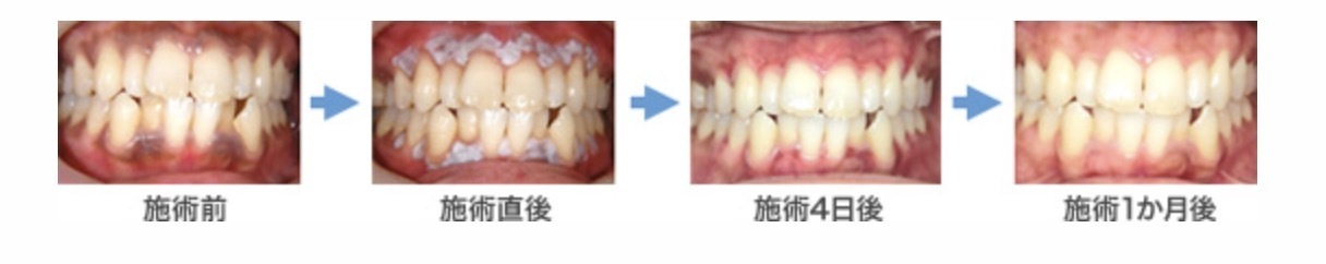 歯ぐきが白くなり、白い皮が浮いてきて2日~1周間程で自然とめくれてきますので、2週間程大切なご予定がない日の施術をおすすめします。 無理にはがそうとすると痛みが出て、歯ぐきにもダメージを与えるので、痒みや違和感があっても、自然にはがれるまで我慢してください。